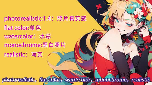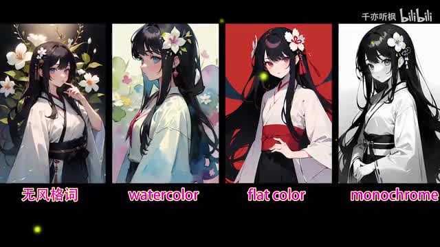 我测试了一些绘画形式的词汇。得到了几个比较好用a i能识别的风格关键词fa color color color平涂、厚涂风都有flat color相当于是一个相当于是厚图,monocle相当于是一个去色的黑白滤镜。