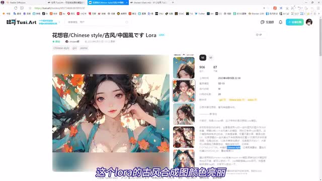 刚才分享的模型,你可以来吐司这个a i网站下载这个花想容就是刚才介绍的那个laura。这个laura的古风合成图颜色亮丽,有明显的冷暖色,搭配手部仍是问题。直接点这里,下载在这里。作者推荐使用的模型有chosen lyrics mix这一个土司art。