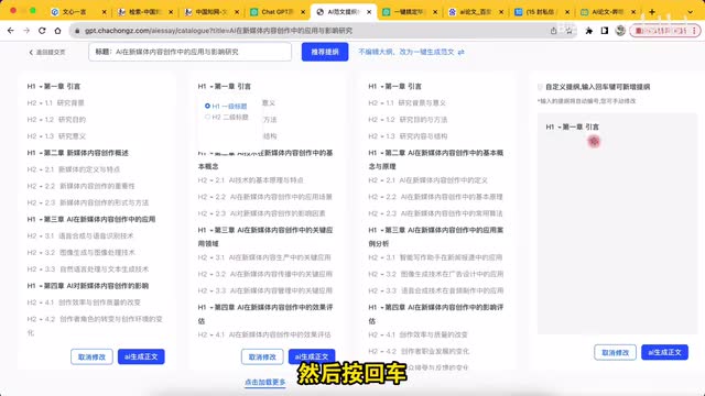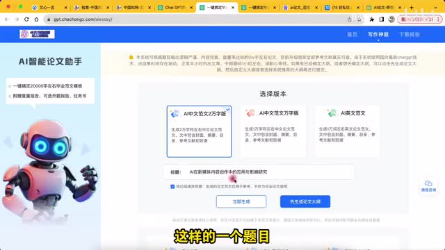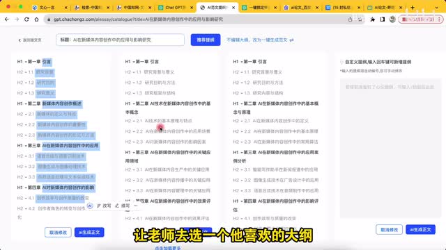 好,我进来这个网站g p t点查询z点com然后呢我选择这样的一个两万字的版本,毕竟字数越多,后期我们修改的空间就可以越大。然后我这里要输入一个题目,操作很简单,我们直接把我们的题目粘贴到这里。我填的标题是a i和新媒体方向的这样的一个题目。这个时候我们如果说只有一个题目没有大纲的时候,我们可以点击先生成大纲网站,就可以根据我们这个题目推荐出来我们几个不同的大纲。我们来看一下,可以看到目前网站自动根据我们的这个题目呢推荐出来了,就是三个不同的大纲。