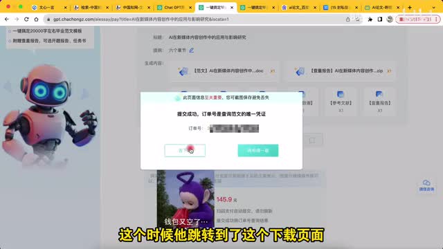 同时我们如果说现在只是在开题的阶段,也可以和正文一起去生成,给我们的开题提供更多的一些参考的内容。然后我们进行扫码支付,好,支付成功。这个时候它跳转到了这个下载页面,然后我们点击去下载。这个时候我们等待它出结果就可以大概二十分钟左右的时间。在等待的这个时间里,我给大家说一个小技巧。