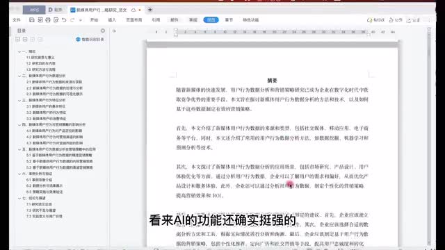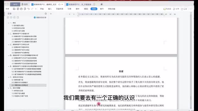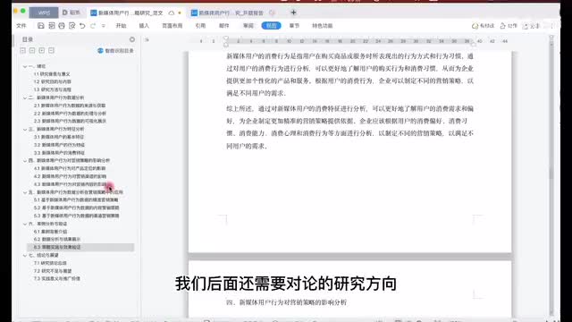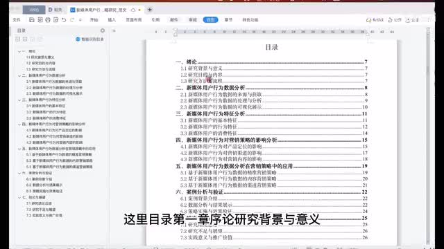 然后英文摘要都帮我们写了,写出来了。再往下面看,这是一个它的一个整体的目录结构。这里是目录,可以看到整个目录的结构格式都帮我们调节好了。看一下这里应该都是带链接的。这里目录第一章绪论,研究背景与意义,第二个是研究目的与内容,第三是研究方法与流程。然后第二章新媒体用户的数据分析,第三章新媒体用户的特征分析。第四章新媒体用户对营销策略的影响分析。第五章新媒体用户数据分析在营销策略中的应用。