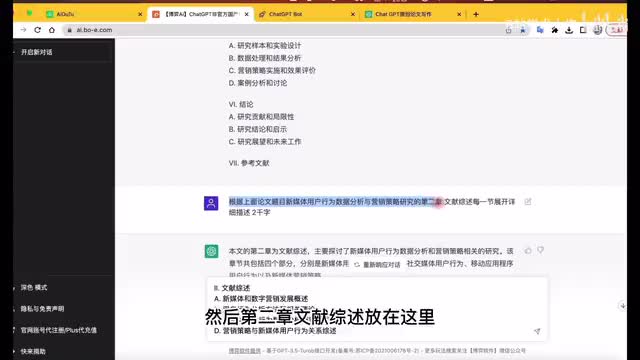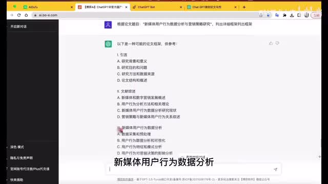 根据论文题目新媒体用户行为数据分析与营销策略研究,列出我论文的详细框架,然后发送。确实g p t在国内使用这些镜像框架的时候,会有一些速度比较慢的问题,这个时候我们都需要耐心等待一下。那这里可以看到拆c p t在不断的帮我们生成这样的一个论文框架,它应该都是符合我们论文的这个整体的思路是非常严谨的。可以看到这里生成的论文框架里面,文献综述、分别性用户行为数据分析、营销策略优化研究、论证研究和案例分析。最后的结论,最后的参考文献,我觉得这样的一个论文结构都是可以去直接去使用的。下面呢我们就需要让chat g p t帮我们把每一节下面的具体内容进行生成。我们要去如何提问呢?这里也帮大家列出了这个框架,我们把这个提问框架先放到对话框,然后把相应。题目和每一章要问的内容放进来,这个就是论文题目进行复制粘贴。