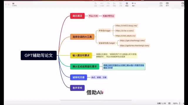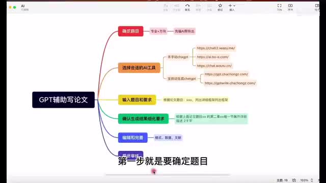 如何从零快速写完一篇论文的方法,还给出了一整套的方案。进行了多次提问之后,我把chat g p t的回答总结归纳了一下。目前这个图就是经过chat g p t的回答我总结归纳出来的,用我们的a i去辅助写论文的一个基本。步骤可以看到,这里面基本上可以分为六个步骤。第一步就是要确定题目,这一部分我之前也出过专门的一个视频介绍如何去确定一个论文题目。不过这里我们今天要用ai去帮助我们去生成一个题目。第二个步骤就是要使用合适的a i的内容。第三步就是要去在ai当中输入我们的题目和要求,让他帮我们列出框架。