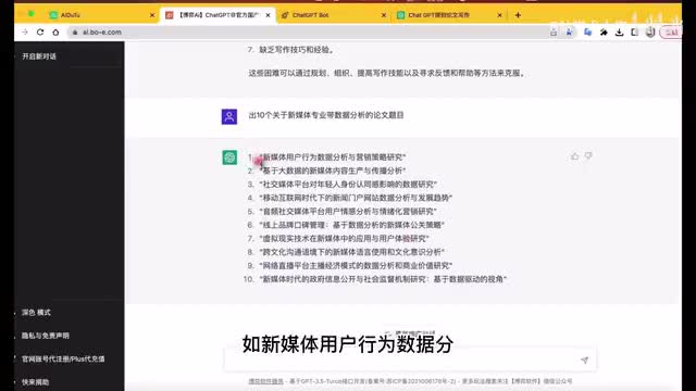 然后这里就提出十十个关于新媒体专业带数据分析的论文题目,看chat g p t会给我们怎样的回答。因为它都是国外的一些网站,所以可能速度会慢一些,我们耐心等待一下。好,现在他帮我们出来了。大家看他出的十个题目都非常的专业。比如新媒体用户行为数据分析与营销策略的研究。我觉得这个题目就很好,我们就以这个题目为例进行一下复制。看一下我第二步的这个提问的格式,然后把这个题目粘进来,然后再复制一下我的题目和要求,让它列出详细框架。我们再回来这里粘贴。