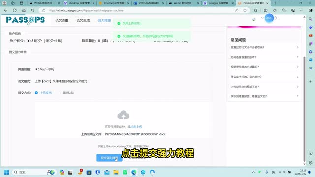 我们把刚刚准备好的论文上传进来。点击提交强力降重。论文的降成结果一般需要等待三到五分钟。