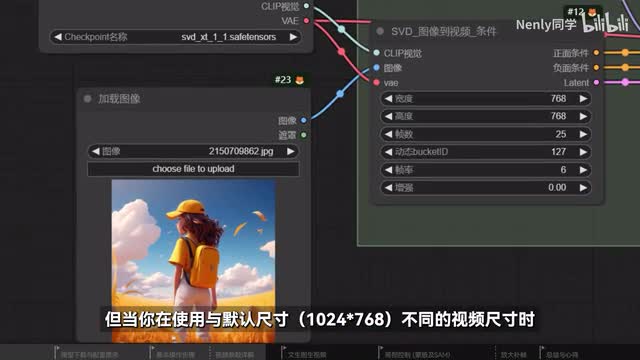 相似之处。首先我们在最左侧的check point加载器这里加载刚刚下载下来的s v d模型。随后在下方的图片加载器处输入一张想要让它动起来的初始图片,可以直接从电脑上的文件夹把图片拖拽进来。这张初始图片的尺寸最好和你最后生成的视频尺寸比例保持一致。那视频的尺寸在哪里调整呢?看到右边这个条件节点,在这里你可以设置视频的宽度、高度和帧数、帧率的基本选项,其中视频尺寸我会推荐按照默认设置的幺零二四乘五七六来。因为s v d模型是在这个尺寸的视频上训练的,所以我们也应该尽可能把初始图像裁剪到十六比九的比例上。视频的帧数决定了视频的总长度,同样会根据你选用的s v d模型而已。原版的最佳选择是十四帧,x t版则是二十五帧,而f p s代表每秒播放的帧数,可以维持默认六不变。