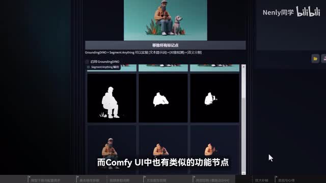这里有另一个工作流,运用到了coffee二中的segment anything组件,通过两个功能强大的ai抠图模型,可以帮助我们智能识别并选定图像中的区域。其中g a n i d i n o是一个强大的零样本检测器,能够根据文本描述来检测图像中的任意物体,生成一个大致的区域范围。而sam可以在这个区域里做更仔细的分割,把这个东西抠出来并生成相应的模板。在web u i里有一个非常受欢迎的扩展segment,anything就用到了这项技术。而同比二也有类似的功能节点,用它们在静态图片上智能抠图早就轻而易举。把它们嫁接到s p d的工作流里,会有什么奇妙的化学反应呢?这个工作流的使用方式和刚刚那个差不多,但不需要手图蒙版了,只需要在这里。用提示词描述你想要动起来的画面元素,再按照刚刚讲的方式设置好视频参数看,它就会智能的识别出画面里的对应位置,并且使用和刚刚类似的手段生成蒙版让它动起来了。这样选取区域精确度和效率都比手画高多了。
