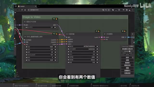首先是这个运动统i d,它是s v d模型里最直观的控制视频运动幅度的参数,默认幺二七范围从一到二百五十五越大运动幅度就越剧烈。如果运动太过剧烈导致画面变形了,就降低它。反过来,如果画面不怎么动,就可以适当增大它和运动间接相关的另一个参数是这两个节点里的最小c f g和k samper里的c f g数值。c f g是五分类器指导的缩写,和图像绘制中一样,在控制绘制内容与条件的相关性,你会看到有两个数值是因为s v t采用了随帧数动态控制c f g的思路,在绘制第一帧内容的时候应用最小值。然后逐渐增大到最后一帧时变成k三play的最终c f g,以此来适应视频不断变化的画面。官方解释它的作用是保持原始图像的忠实程度,低则画面会更更自然,更高的画面会更稳定。如果实际嬷嬷中发现它不会影响大的运动过程,但会影响运动推导的细节。如果你的画面里出现了类似这样不成一团的成分,就可以适当增大。