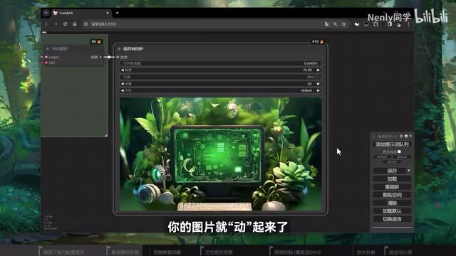 这样会生成一个约四秒左右的视频。随后再在右边设置k采样器里的各项参数,这些参数和绘图时的作用基本一致,如果你不了解它们的详细作用,也可以维持默认不变。设置完毕,点击一下边栏上的添加。提示词队列等待读条完毕,在最右边的保存窗口里就会输出一段视频,你的图片就动起来了。你可以在coffee u i根目录的输出文件夹里找到这些图片,也可以右键点击将它保存下来。很简单对吧?不过按照默认的这一套参数运行,有时生成的视频效果会有点奇怪。碰到类似这样的问题时,我们就得去更改下面这一系列和视频生成有关的参数了。这其中有三个是你需要重点关注的。