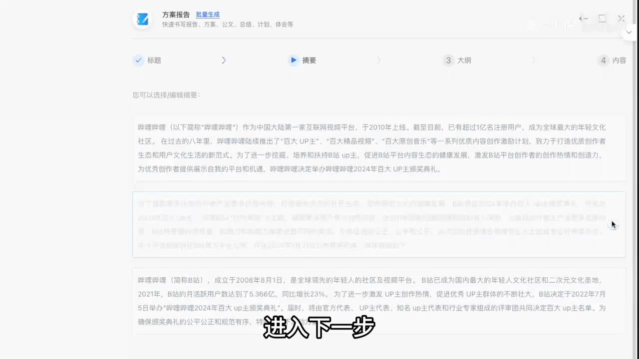 我们就以写个一千字为例,让ai写一个哔哩哔哩二零二四百大up主颁奖典礼的方案。输入之后可以看到它生成了一个摘要,也就是为什么要办百大,以及百大怎么办?进入下一步,他列出了五条大纲,分别是活动的时间、地点、报名方式、流程和注意事项。如果觉得没问题,可以点生成。于是我们就直接获得了一个a i写的初步的百搭方案。我看了一下,除了这个活动地点,他给你扩了六个场地,直接按照春晚的规则来办了,其他看起来都还是比较合理的。