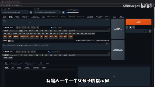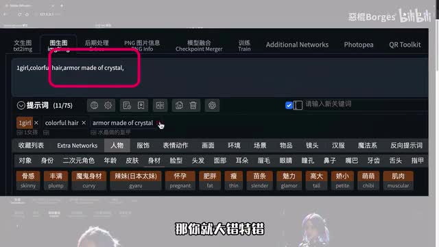 前面图层图终极指南我们讲过一个就是图生图转换风格的方法,重绘幅度在零点六左右会有比较好的转化效果。但是零点六的重绘幅度要求我们的提示时要足够精确,否则就会像我现在这个样子,我输入一个一个女孩子的提示时,凭空会出现一些其他我不想要的东西。在这种情况下,我们只需要再挂一个贴,要模型选择更偏向跟受虐的模式。这种模式下就可以看到连身体上的纹路都他妈的是正确的。
