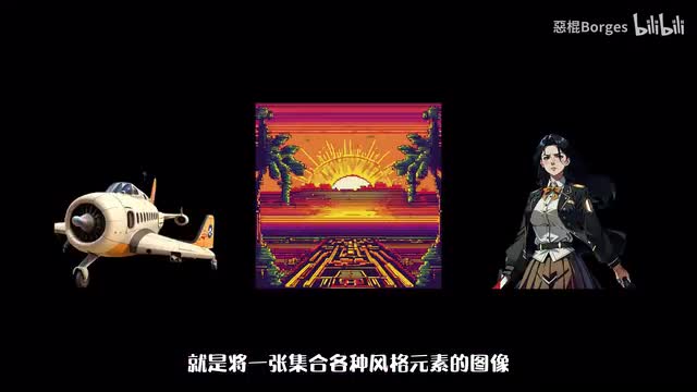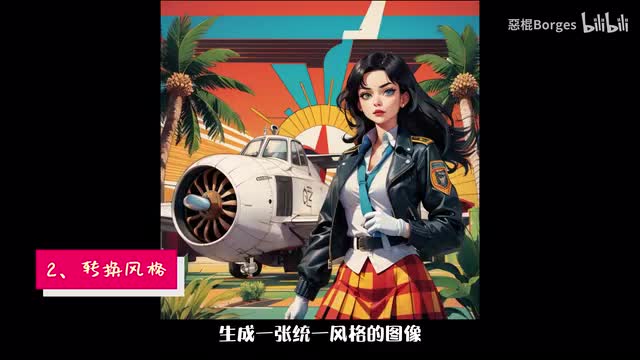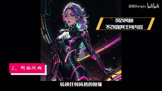 如果有局部没有被照顾到,比如说这里的头发颜色不太对,贴合暂时无法控制,我们可以在提示时里面追加头发的颜色。for for here就可以了。那么呢由此衍生出来的另外一种用法,就是将一张集合各种风格元素的图像放进贴有模型选择偏向提示值模式。它可以转换成一个统一风格的图像,而且根据我的观察,偏向提示值模式,它还会自动合理化空间关系,还有透视关系。