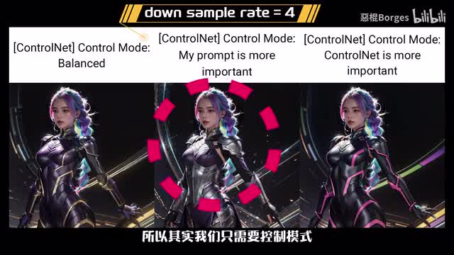 我们在不同的控制模式下可以看到偏向提示词模式的细节修改的幅度是最大的。而且当simple read等于四的时候,修改幅度远远大于等于一的时候。所以其实我们只需要控制模式选择偏向提示词模式。当simple rate改为四,然后在提示词里面写上透明的盔甲,应该就可以把这个盔甲改成透明的。