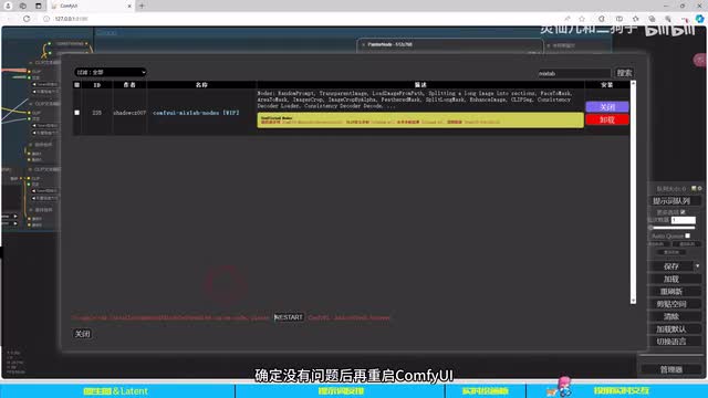 这里可以看到下方已经显示安装完成,但后台是没有进行gate下载的。这里就是之前提到的,虽然显示安装成功,但是由于网络问题,实际上已经报错了。所以遇到这种情况,再次点击安装即可。确定没有问题后再重启咖啡u i现在我们就可以建立投屏节点了。右键新建选择max lut节点,选择图像建立屏幕分享节点,和之前一样替换画板节点,直接将分享节点的图像触点连接到采样组的唯一编码器。
