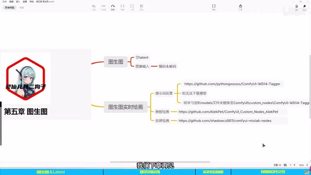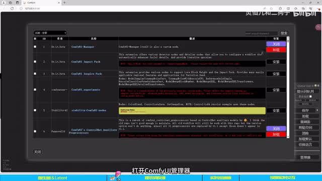上传一张地图运行,检查是否有缺失连线,补齐连线之后点击扩散,ok带有t十四反推功能的图层图工作流就搭建完毕了。最后同样将采样器建立组,并导出工作流文件放到学习资料供大家学习参考。当我们明白了图形图的搭建方式,接下来的图形图实时绘画搭建就简单了许多。只需要将我们加载图像的节点替换为一个可以进行实时绘画的画板,再利用l c m的速度优势就可以完成画板的实时绘画了。打开康复u i管理器,点击安装节点,粘贴节点名称,点击搜索,点击安装,查看后台进度,最后重启conf y u n。