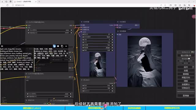 运行节点后,我们可以看到书的月亮提示词与反推的提示词已经组合在一起了。现在在执行扩散任务o k图像中也增加了月亮的元素。当然如果当我们不需要反推提示词组的时候,也可以直接对图像和反推节点进行忽略处理,后续就不再需要反复添加了。确定工作节点没有问题后,我们再来整理工作组,调整到合适的位置。随着我们的节点越来越多,连线越来越反转,这个时候我们可以通过转接点对功能组中的重复节点进行整合,方便我们后续的调用。