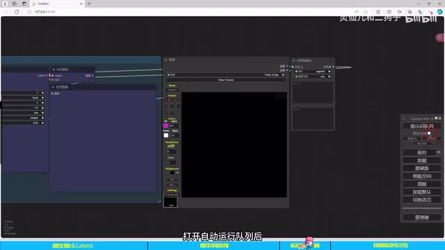 现在我们就可以通过右键新建节点,选择a l e k节点并建立绘画节点了。再将建立好的绘画节点的图像触点连接到唯一编码器,同时将正向提示词输入框移动到画板旁边,方便我们随时修改使用。打开自动运行队列后,就可以通过画板进行实时扩展了。该画板的功能类似p s的操作方式,可以进行各种绘画操作,调整颜色设置线条粗细设置。明度或者是绘制形状圆形、方形、直线,还可以进行分层调整都没有问题。