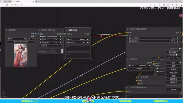 老规矩,先整理其他工作区,然后新建节点选择使用工具建立字符串操作节点,再右键字符串操作节点选择将文本c转。为输入连接反推字符串到文本c最后再将字符串连接到正向的文本编码器字符串节点有两个操作方式,一个是附加,一个是取代。取代的功能现在我们还用到。而附加顾名思义就是将a b c中输入的文本按顺序合并在一起。现在我们就可以通过输入框进行提示词添加了,比如添加阅历。