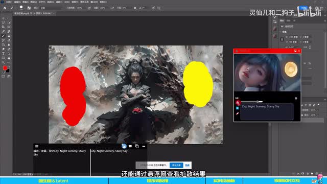 现在我们就可以点击分享节点中的分享屏幕,再选择我们需要投屏的窗口了。这里以p s为例,点击共享,共享成功后,我们还可以回到咖啡源,通过设置区域设置投屏窗口中的投屏位置以及大小。最后点击直播运行。现在运行扩散任务就可以通过我们设置的投屏图像进行扩散生成了。为了方便在p s操作的时候可以随时查看结果,我们还可以从最后结果的唯一解码器图像触点拿取,建立mix blood节点中的屏幕窗口节点,也就是悬浮窗。
