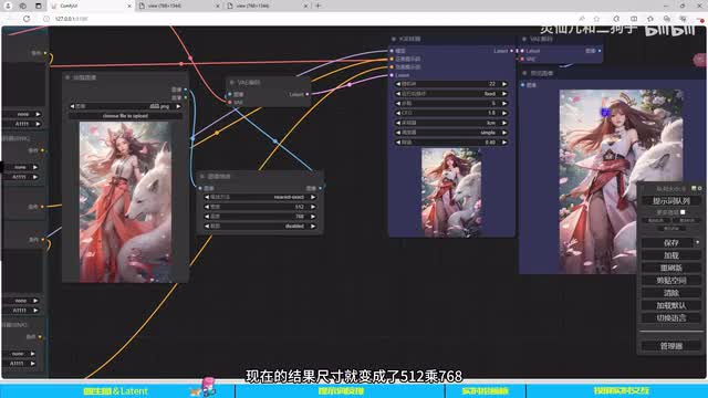 如果我们想要将扩散结果设置为我们需要的尺寸,则需要在图像出点拿出新建图像,选择放大,再选择图像缩放,并设置缩放尺寸为五幺二乘七六八,将原图调整到我们设置的大小后,再连接到v一编码进行转换,再次执行扩散任务。现在的结果尺寸就变成了。五幺二乘七六八。但是当我们把高度设置为九幺零的时候,再次进行扩展,图像尺寸从九幺零变成了九零四。这里出现尺寸变化的原因是因为图像在进入到later时,是将长和高缩小八倍后转换为潜在向量。
