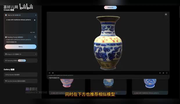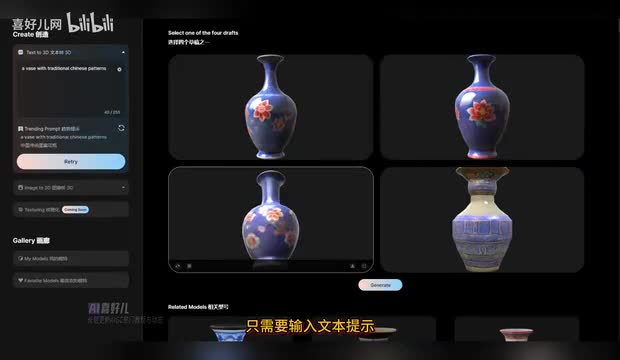 triple a i会推荐随机提示词,只需要输入文本提示即可生成四款三d模型。