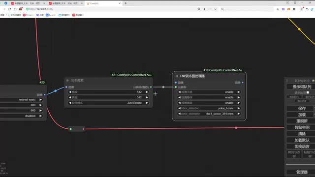 上传我们已经准备好的这个视频。那我们做视频的转会呢需要两个connect去协助。那第一个connect呢主要是为了加载open pose,也就是我们一个t w的一个自带处理器。那第二个呢是给它一个connect模型,那我们呢先给它加载第一个d w自带处理器。我们右键点击节点,找到这个宽带的预处理器。找到面部与姿态啊,这里呢就有一个d w姿态与处理器。然后呢,我们需要控制视频的尺寸,我们从图像这里呢。