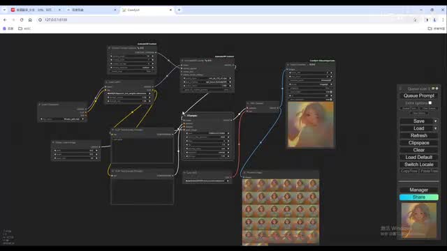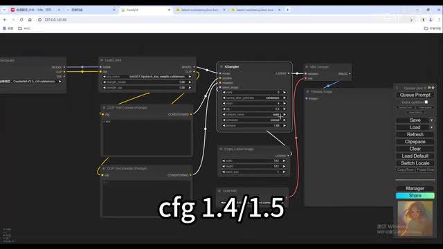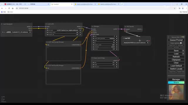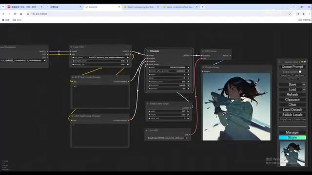 右边的lighter连接v e解码器。把v一拉出来给一个v一的加载器节点啊,用八四零零零就好。图像呢我们给一个预览的一个节点,这样呢基本的工作流呢就搭建好了。这项提示我们给一个one girl和尝试。