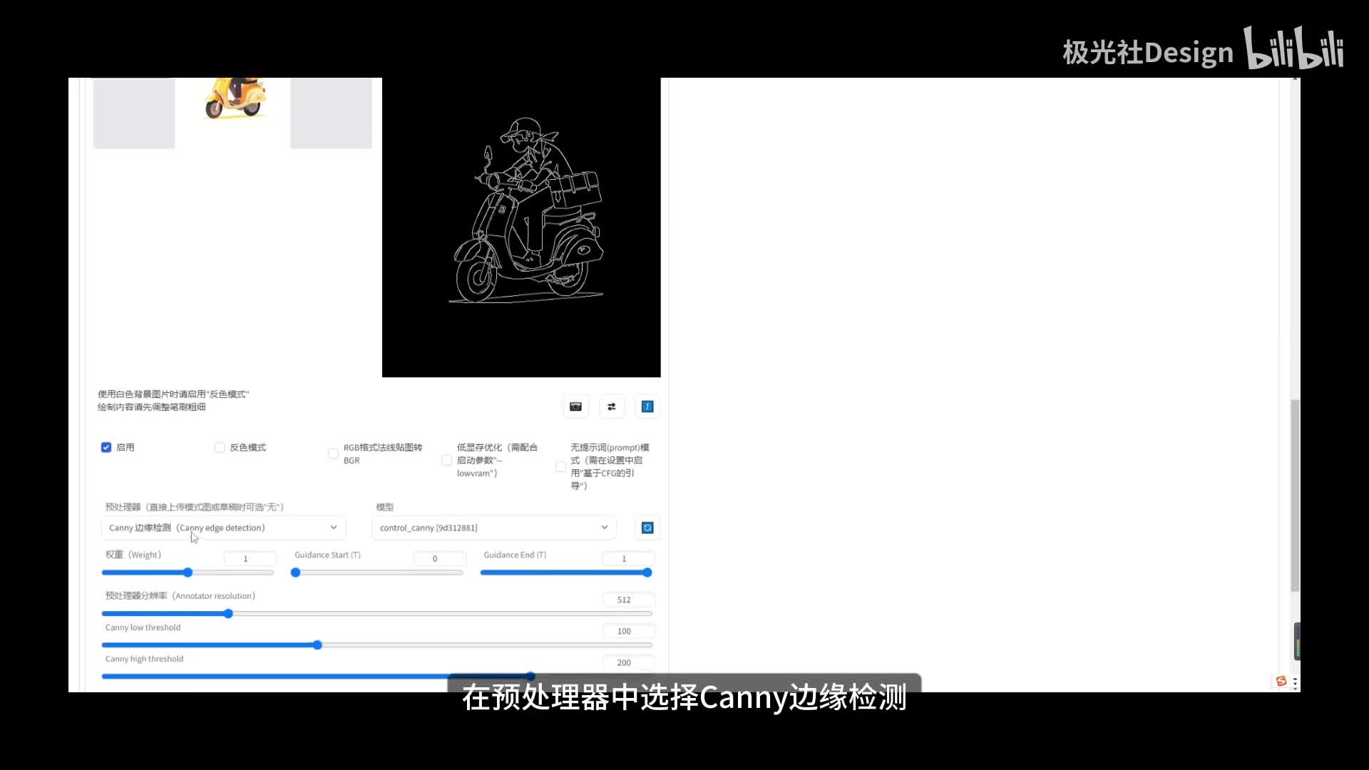这些模型都可以在c站中下载。使用control net来固定人物和电动车,拖入图片后点击开启,在预处理器中选择kenny,边缘检测模型也选择canny。点击预览预处理结果按钮。
