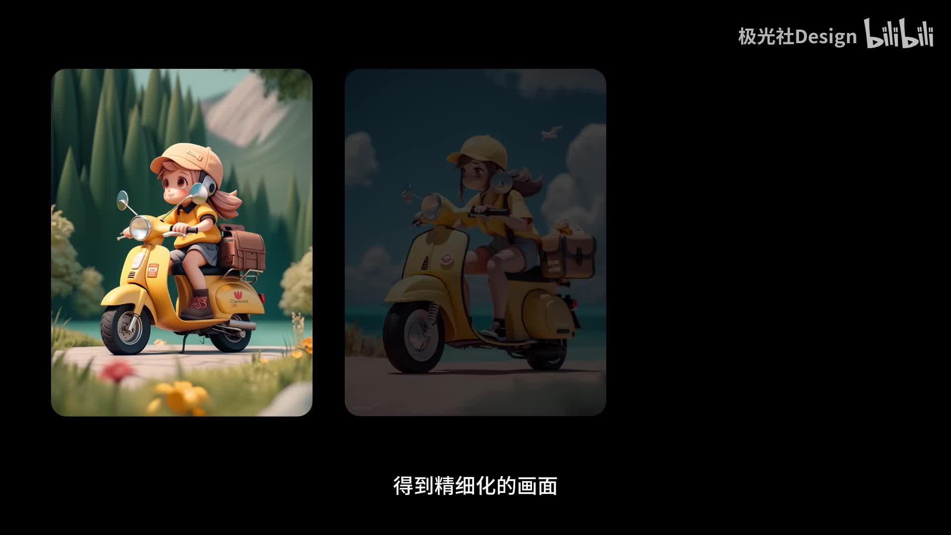 复制图片链接后输入这段描述。得到精细化的画面,与原图相比,矫正了人脸和手,画面也精细了很多。根据如上格式,我们对描述文字进行修改,生成其他两张。