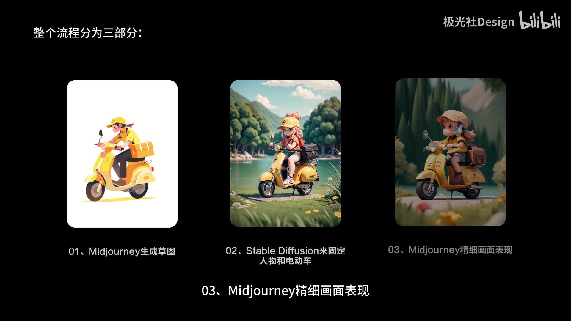 在设计过程中,使用了stable diffusion来精准控制人物电动车,然后通过描述词来生成不同的背景。接下来我会详细的进行讲解。大家对ai绘画感兴趣的朋友,可以加入我们的ai绘画交流群。