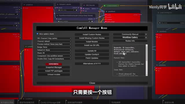 举个直观的例子,在商城时加载多个多的模型,如果使用。自带的节点功能。你只能像这样调出一个个单独的loader节点,然后再把它们串接到一块。但一些自定义节点就提供了类似的批量加载功能,让我们在一个节点里就能调用多个模型,甚至是把它和大模型、提示词等捆绑在一起去输出,让工作流变得更高效、简洁。正因如此,许多高手设计的工作流里都囊括了一系列复杂的自定义节点,但在本地运行这些工作流,是你的电脑上也必须安装有相同节点,否则就会像开头展示的一样报错丢失。但其实碰到这种情形,只需要按一个按钮,这些节点就可以被完全自动的一个个对号入座了。你想知道是怎么做的吗?今天这期视频目的就在于带领你全面的了解cop u i这个自定义节点系统,并掌握通过k i s c o o以及com u i manager的方式安装管理节点的全套方法。同时在这期视频里我也会为你推荐一系列非常受欢迎的自定义节点组合,来帮助你升级你的copy i如看完了以后感觉有所帮助,请别忘了回来一键三连哦。那我们就从最基本的节点安装方式开始讲起吧。在康体u i里节点的呈现形式是这样一个搭载了各种功能与选项的小窗口,让它的本。