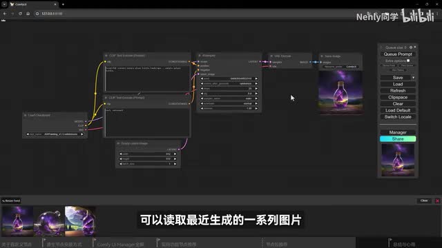 它的开发者五个s老师名字里的python,除了那个大家都认识的编程语言以外,也可以被翻译成蟒蛇。所以它开发的节点和涉及到的功能选项里都会有一个小蛇的一模型符号。刚刚讲过的提示字母全只是。它功能的一小块比较实用的功能。在设置菜单里,其中就有一个设置图像面板位置的选项。这个图像面板是通过设置按钮旁边的另一个按钮来展开的,有点类似于我们在web u i中常用的图库浏览器一样,可以读取最近生成的一系列图片。点击左上角图标还可以设置缩略图的大小。它的默认位置是在界面的下方,但通过节点的设置就可以把它移到上下左右的任何一个方位,或者是设置图片的陈列顺序。右键菜单里也塞了几个隐藏功能,例如节点的锁定,被锁定的节点角落会有一个小锁头的标志,无法位移,适用于固定节点的版面位置。还有自定义颜色,上一节课里我们也尝试过的,记住color的选项来给节点改颜色,从而实现节点的区别和分类。