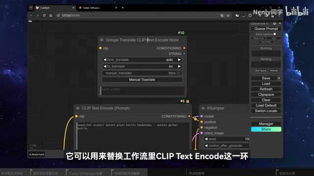 不过提示词也是需要以英文来书写的,对于绘图经验没有那么丰富的初学者而言也挺头疼的。有没有可能连提示词也汉化了呢?在comp以外里,一切皆有可能。你可以下载这个由开发者eec px制作的翻译界面。一个小技巧,在你安装完一个新节点以后,如果想要快速找到它,可以在操作区域的空白处双击一下,就可以调出一个可以输入文字的搜索菜单,输入translate就可以看到这些翻译界点了。它可以用来替换工作流里clip text in code这一环。我们把两头的clip和conditioning拆下来,重新接到它身上,直接在这里输入中文。提示词默认的参数会自动检测语言并翻译到英文看,模型就帮助我们把中文描述的内容画出来了。这个节点是在线调用翻译服务的,所以有时候会面临网络连接的问题。如果你使用的过程中有障碍,可以尝试使用这个纯本地进行翻译的argos翻译节点,或者通过这个deep翻译界面切换不同的翻译。请定义更多和翻译服务相关的参数。