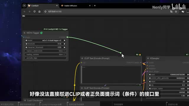 但我猜很多时候你在web u i里的绘图提示词都不是自己写的。除了网站上抄的,还有通过tag一类的插件反推出来的对吧?对于很多资深用户而言,tiger是工作流里必不可少的一环。巧的是conf e i里也有tag节点,就是出自刚刚这个custom script的作者大佬之手,用图片加载器给它输入一张图片,它就可以在运行工作流的过程中智能反推提示词,然后再把提示词输出给后续的节点。注意反推需要下载一些额外的模型,如果自动下载失败,你可以手动将它们下载并改名,放进节点文件夹的对应位置,具体请参考教程的资料页。但你注意到了吗?这个输出的提示词格式有点特别,叫做字符串,好像没法直接怼进clip或者正负面。提示词的接口里,那怎么用它来生成呢?仔细看,我们右键单击一下输入提示词的这个clip编码器框,在选项里有一个转换为输入的选项,它可以把节点上那些需要通过手动设置或者输入的选项单独转换为一个接口,从而让它具备接收外部信息的能力。点下去以后,那个可以输入的文本框就不见了,但多了一个文本接口,再尝试连一下字符串是不是就可以进来了当你解锁了这个玩法以后,你会发现写提示词好像就没有那么困难了。但我很喜欢的一个节点叫做自动负面提示词。词可以用来生成负面质量的提示了。这个节点用类似的方法接近负面词的文本端口里,你将增强负面参数调成一,你就可以实现全自动化的提提示词运作了。