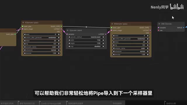 这是一个默默认节点搭建的高清修复工作流。因为高清修复的本质是生成一次以后,再放大之后再重新进行一个检验。所以你会看到两个k samper。这个时候从模型加载器里拉出来的model,以及文本编码器转换完以后的conditioning都被反复拉了两遍。它们通常是会被一起使用的,在选项上又是分离开的这就导致每新增一次生成都要重新再拉一次。这么多条线操作麻烦还容易乱。不过在impacts pack里有一种特殊。pipe式的k sample的就可以让我们的操作变得更加轻松。pipe其实是一个编程里的概念,代表一种进程间的单向数据流动。和普通的k sampler放在一起对比,你可以很容易的发现这个pipe版本有什么不同。