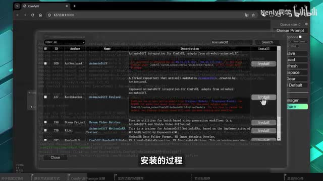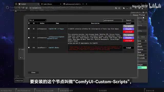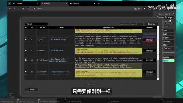 它会从在线地址加载一个包含了几乎所有开发者开发的自定义节点的节点列表。没错,就和我们在web u i常用的扩展安装列表一样。在这个列表中你就可以自由搜索并安装你想要的节点了。在右上角输入节点名字,点击搜索,你就可以筛选出。符合需要的节点,右边会展示它的基本介绍,点击最右侧的install就可以实施安装。安装的过程本质上还是在命令行里为你去执行clone的过程。而当它完成以后,原来的按钮位置会变成已安装的样子。三个按钮分别对应节点的更新、暂执行、禁用以及卸载删除。和刚才一样,安装完了以后一般也需要重启。整个conf u i manager也给我们提供了一个快速选项,到下面点击跳出的重启按钮,再确定它重重启完毕需要要的节点安安装上去了。