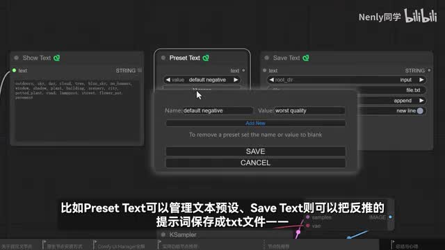 默认的颜色其实就不到十种,但安装了custom script以后,你可以用它调出r g b调色板,把任意一种颜色涂到节点上,增大了编辑的自由度。而它提供的这一系列节点其实功能都比较玄乎,我很难和你描述它有多厉害,但就是挺有用的。比如我最常用的一个展示文本,刚刚你其实已经见到了很多和提示词有关的节点。输出文本串以后。直接进入生成流程里。但如果你想在这个过程里顺带看看内容,就再接触一根线,连这个节点还有一系列和它类似的节点。例如percent tax可以管理文本余设,safe tex可以把反推的提示词保存成p s t文件。对了,还有这个play sum,你只要把它串接在一个工作流的结尾,和接收成品图片的界面并列在一块儿,就会在生成结束的时候有一个清脆响亮来提提醒你它出来了。总而言之,这这个节点包括很多边缘地带,植入了很多富有灵性的功能,某种意义上让coffee u i变得更有用,也更有趣了。还有很多配件,多功能强的节点包是我们今天没有一次性介绍的。