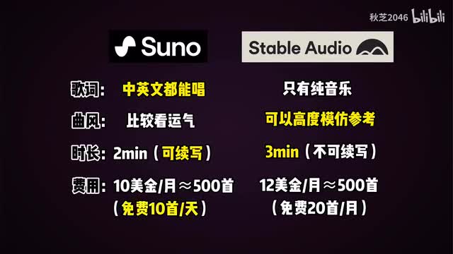 这些工具的价格基本都在一一一一的一一的,所以这个视频真的不是没成本。然后是音乐生成,黄龙彪一拍不能再来个蓝牙。这里给大家推荐两款最好用的大火的sono,只用几句话的输入,人均就达到了音乐的水平。优点呢是能唱中文歌词,免费版一天就有十首歌,三十天就有三百首。