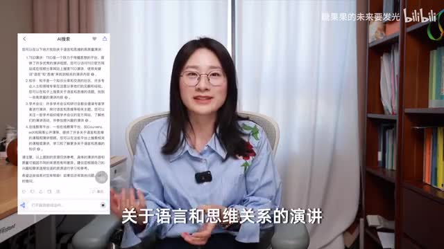 当你有了这个初步的大纲之后呢,你想细化去做每一张p p t的时候,信息源也非常重要。尤其是信息的有效性,还有信息的可靠性。我一般用的是这个天工a i我觉得它的信息源比较科学。就比如我有一次在天空a i上检索这个高质量的关于语言和思维关系的演讲,他就恰好给我推荐了t e d的这个语言如何影响我们思维力的演讲,刚好符合我讲的这个主题,而且还给我推荐了这个m t的一个公开课。我觉得他比较好的就是我问了他问题,然后这些问题下面会有更多的信息源,然后我就去根据他的这些信息源可以去研究这个原始的一手材料。