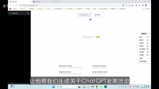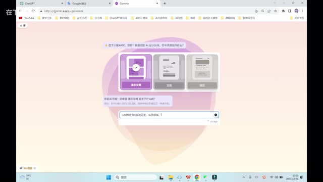 点击演示文稿。大家可以在对话框这儿输入任何主题,中文都可以。我让他帮我生成一个关于chat g p t的发展历史、应用领域以及未来发展前景的大纲。我们点击生成。
