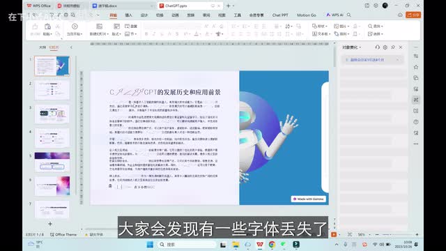 以选择本地字体替换。替换字体,那大家看到就可以了。另外呢我们也可以通过chat g p t让它生成大纲,然后将大刚丢给伽马这个地方,我们给他提同样的一个需求,让他帮我们生成关于chat g p t发展历史以及应用前景的一个设计大纲。好了,现在它已经根据我们的需求生成了十个部分的大纲。
