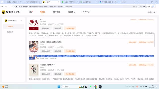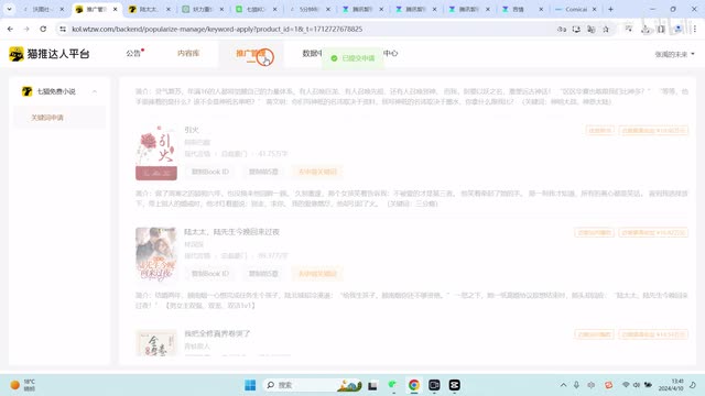 比如说气泡达人的授权地址,我这边已经申请好了。就是我已经申请好了,申请好之后呢,他会给一个可推广的书单,大家可以按照这些来进行推广。推广的话是有返点的。比如说你在抖音上推广,然后用户在抖音上开通的会员是有返点啊。首先我们做这类短视频第一步肯定要看文案。文案的话嗯七猫给的平台给的这个书单上面也有原创的文案。大家如果不想用原创的文案怎么办呢?我们可以用用get t g p t来进行生成。