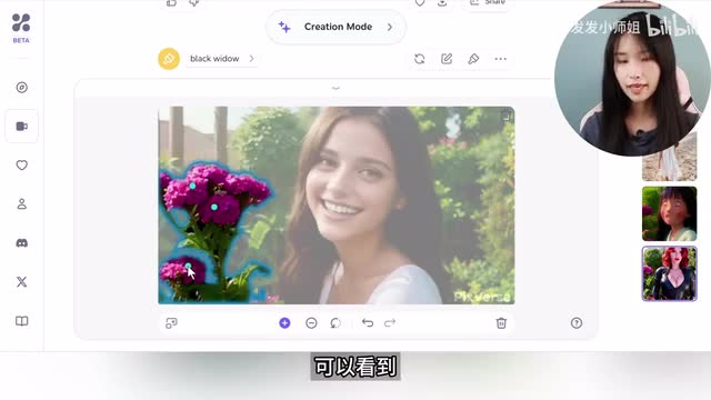 点击加号,我们要首先选中我们需要变更的区域。点一下模特头像的任意一个地方,整个模特呢我们就选中了模特被框在一个蓝色的框框里面,下拉页面,在输入框里面输入我们要变更的内容。比如我这里想把这个女孩变成黑寡妇black widow,点击create等待生成结果。看女孩完全消失了,黑寡妇填充在画面上了。
