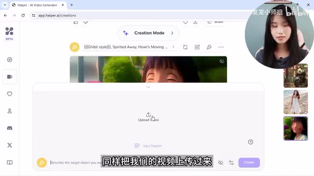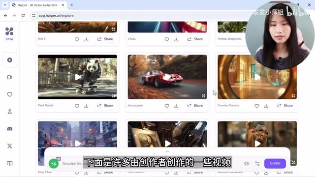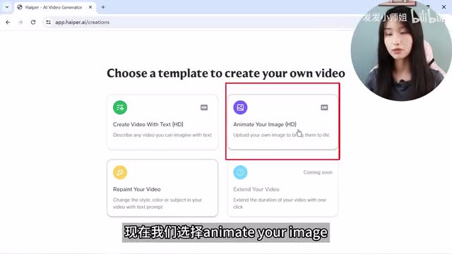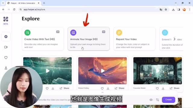 第一个是create video with test文本生成视频,后面有个h d高清的能力。第二个功能是animate your image,也就是图像生成视频。而harper a i最经典的一个功能呢就是repaid your video,也就是它可以重绘你的视频。后面我们会详细讲到。