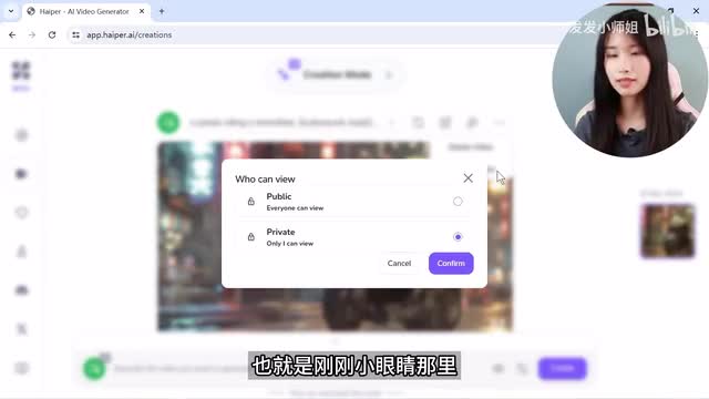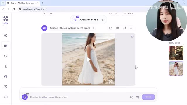 我们点击下方的下载按钮下载到本地,然后点击上方的create mode,回到创建面板。在这里可以非常直观的看到,我们有四个选项可以选择。也就是第一个是刚刚的文本生成视频,create video with text. 现在我们选择animate your image图片生成影片,点击回到生成页面,点击upload image上传我们的图片。我上传这一张海边女孩的图片,然后输入提示词,the girl working by the beach女孩在沙滩边散步,右侧的小眼睛已经是仅个人可看。
