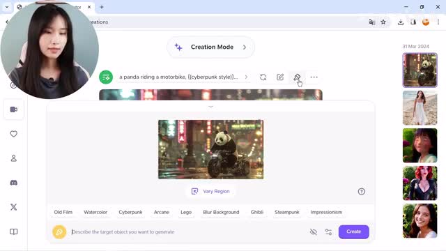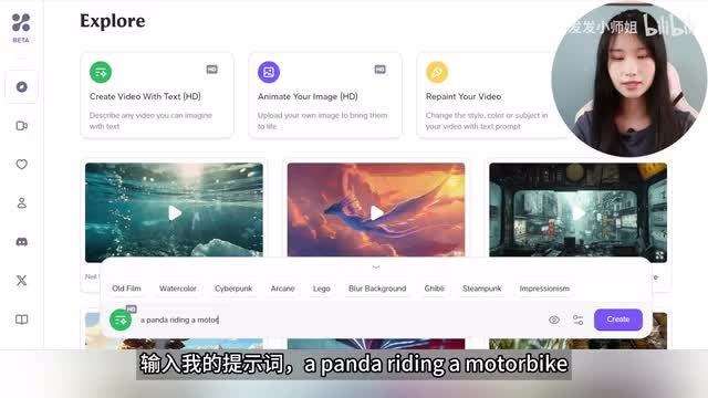 输入框的上方会有一些风格描述,也就是我们想要生成什么样的视频风格,我们就可以点击它,比如old film酒店的模式,watercolor、水彩、cyberpunk、cybook等等。ok我想创建一个熊猫骑着摩托车的视频,在输入框里面输入我的提示词,panda riding a motorbike, 可以选择各种不同的视频风格,我选择subber cyber克。点击了suber pk之后呢,在我的提示词这里它。就添加了一个风格描述,右侧有一个小眼睛的按钮create in public。