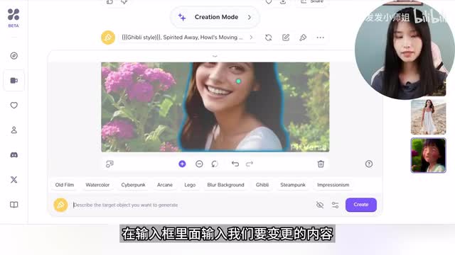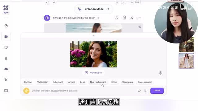 我们点击outlook video上传我们的影片,把这个在花园里面微笑的女孩视频上传过来,可以看到我们可以变更视频的风格,电影水彩赛博朋克blue background是模糊背景,还有zippo风格。我们点击一下风格描述,就自动填充在下面的提示词输入框里面了。同样可以点击设置,填写种子,create生成按钮等待结果。ok我们播放看一下。