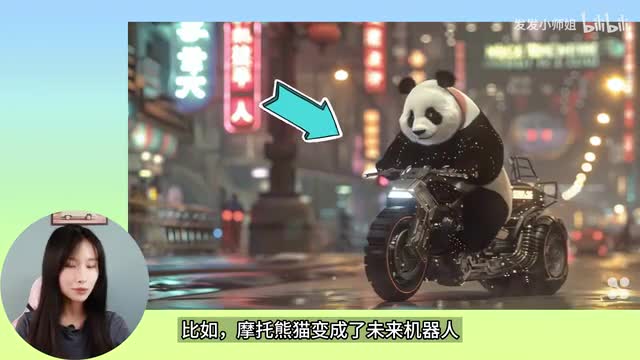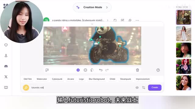细节的地方不要漏掉了,可以一点一点的去选中它。页面下拉,在输入框里面输入future rested robot未来战士,点击create按钮,等待生成结果。熊猫就变成了一个未来战士机器人了。播放看一下。