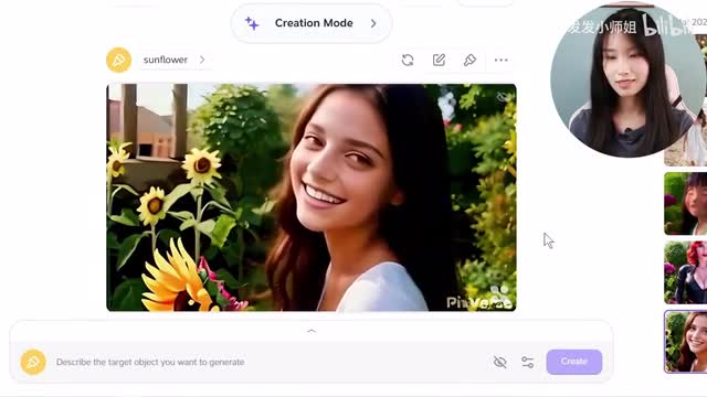 我们这次把花朵选上。如果一次点击没有选中完成的话,我们就需要多次点选,直到把我们想要替换的元素全部选中。可以看到这一束花已经全部被框选在蓝色的框框里面了。页面往下拉,在输入框里面输入sunflower、向日葵,点击create a按钮,等待生成结果。