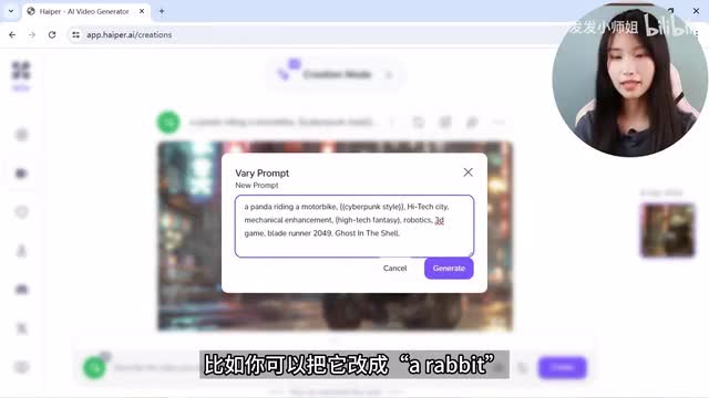 很q很可爱,效果特别好。我们可以看到视频的右上方有几个小功能按键与january是重新生成vy pom就是重新填写我们的提示词。比如你可以把它改成呃ravi的一个兔子在骑摩托车,点击general呢,系统就会自动的重新生成一个新的视频。第三个小工具呢就是repeat,也就是手绘功能。